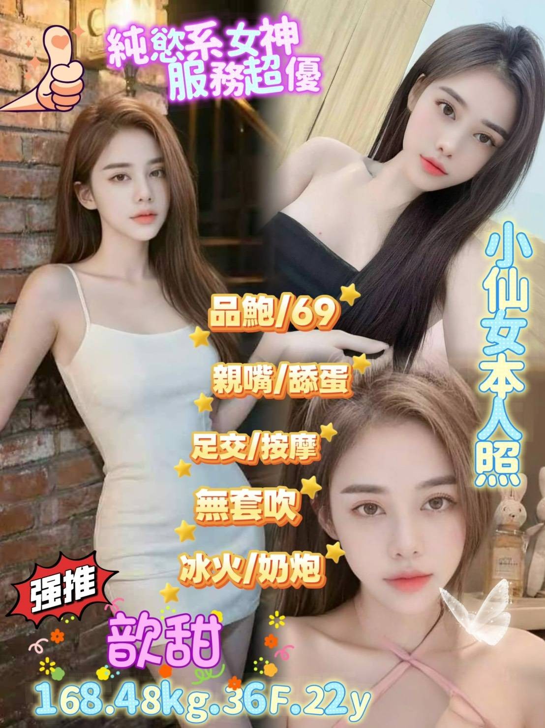 無套吹>小親親>舌吻LG(視口腔衛生而定)>品鮑69>舔蛋舔澤丸>足交>奶炮>包夜5+3>買3送1>買2送1S>簡易按摩>情趣用品>絲襪誘惑(客自備)