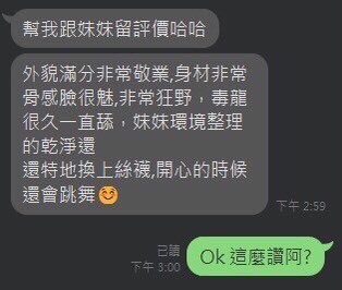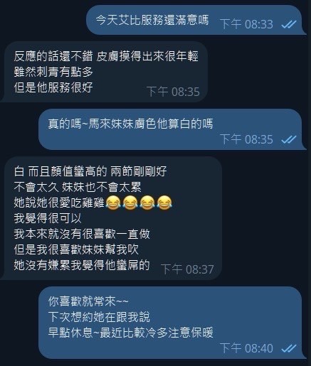 (snapping fingers)服務項目:調情共浴/愛撫調情/無套吹/深喉嚨/舔蛋/小親親/LG/屁推/臀推/69/品鮑/奶炮/胸推/潮吹(依貴賓技術而定)/全身紓壓/射後清槍(口爆適用)/白人