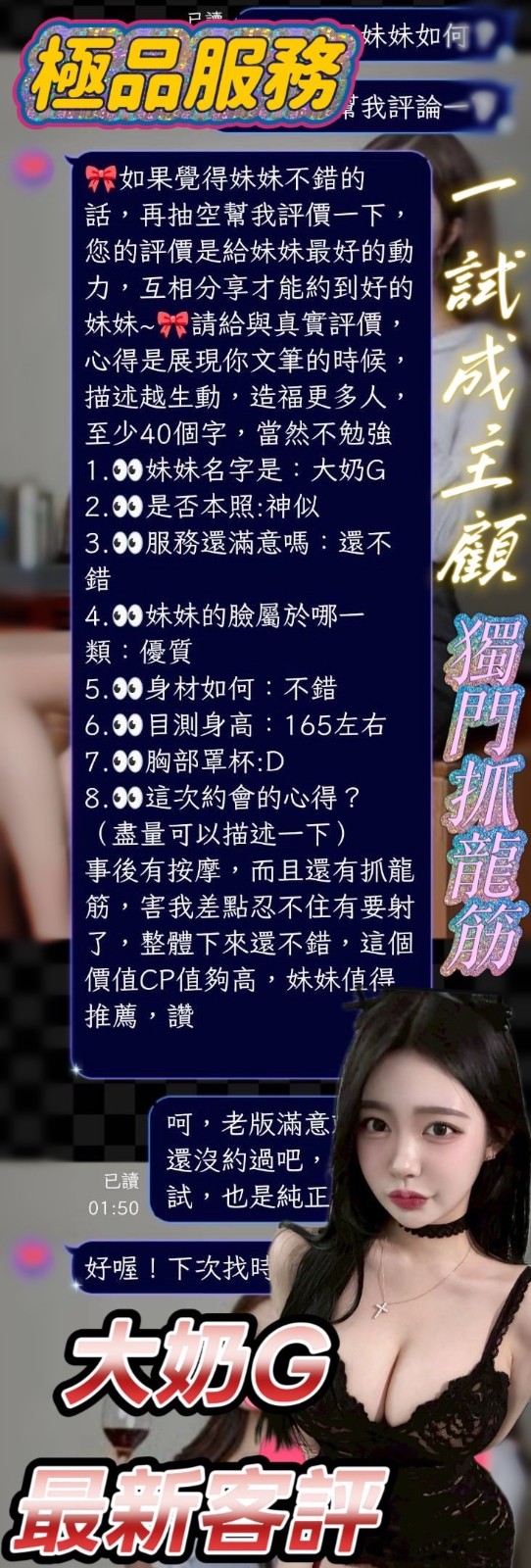服務項目:共浴/無套吹/舌吻(視口腔清潔)/小親親/按摩/乳交/胸推/臀推/舔蛋/品鮑/69/毒龍/角色扮演(性感內衣)…
