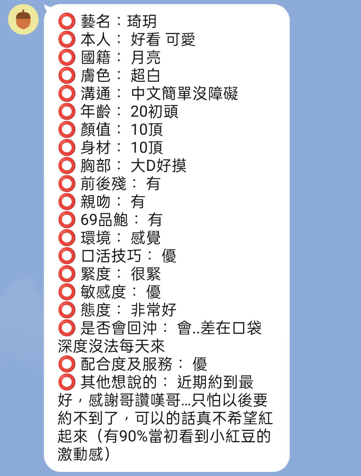 腰力很好 口技不錯 下面很敏感~   Review by 董**